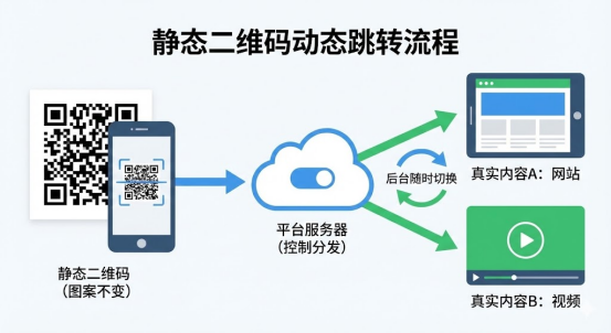 活码的核心逻辑是在二维码和最终内容之间加了一层云端中转。扫码后先跳转到平台服务器,再由服务器分发到真实内容。这样一来,二维码图案始终不变,但后台随时可以切换指向的内容。