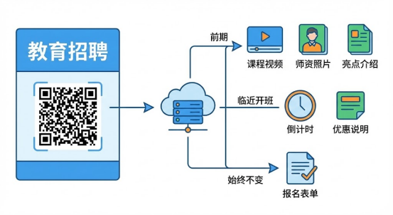 教育机构的招生海报也是典型应用。活码里放课程介绍视频、师资照片、课程表、优惠政策说明,最后再加个报名表单。内容随着招生阶段调整,前期主打课程亮点,临近开班就突出优惠倒计时,但海报上的二维码从头到尾都不用换。