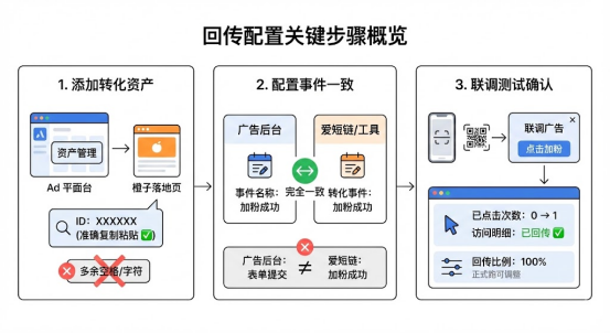 用户点击广告后,会经历几个关键节点:看到落地页、点击加粉按钮、跳转到微信、完成添加好友。但只有"加粉成功"这个最终转化动作,才是广告平台真正需要的信号。回传的技术实现依赖API接口。用户完成加粉后,系统会通过预先配置好的接口,把转化事件、用户标识、转化时间等信息打包发送给广告平台。这个过程可以自动触发,也可以手动提交,具体取决于你用的工具和配置方式。