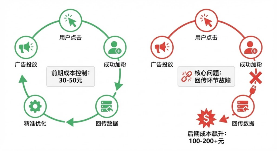 投抖音、快手、百度这些信息流广告,大多会遇到一个困惑:前期加粉成本能控制在30-50元,但跑着跑着就飙到100多,甚至200多。问题往往不在创意或出价,而在于回传环节出了岔子。广告平台收不到真实的转化数据,就没法精准优化投放策略,预算自然打了水漂。