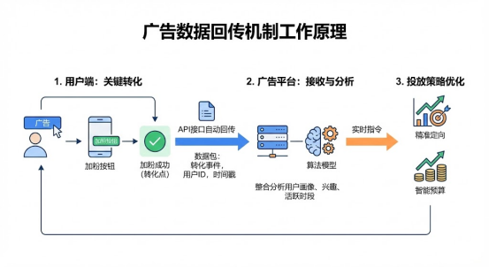 投信息流广告加粉,很多人只盯着点击量和曝光量,却忽略了一个关键环节——回传机制。当用户完成加粉动作后,这个转化信号能否准确反馈给广告平台,直接决定了你的获客成本是越跑越低,还是越跑越高。本文拆解回传的底层逻辑,帮你看清这个隐藏的成本优化器。