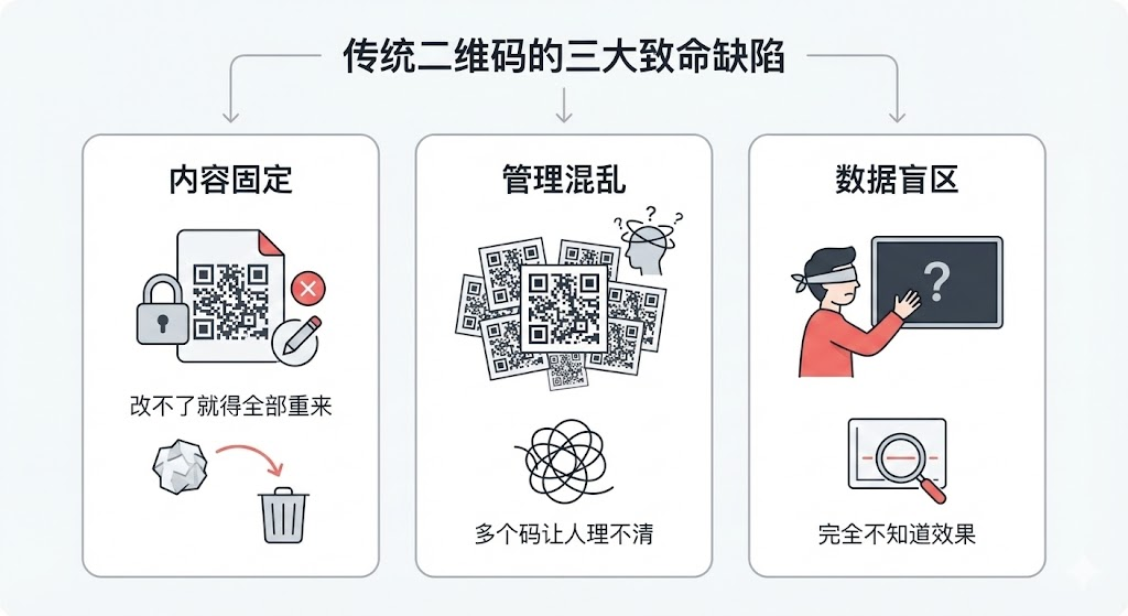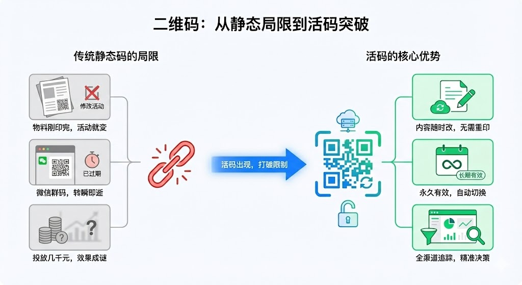 传统二维码印刷后无法修改、群码7天过期、投放效果全靠猜——这些问题让很多运营人员头疼不已。活码技术通过云端内容管理和数据追踪,把二维码从"一次性工具"升级为"可持续运营资产"。本文拆解活码如何解决三大核心痛点,并提供实际应用场景参考。