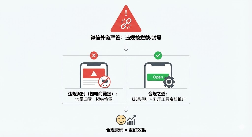 微信外链管理越来越严,违规链接会被直接拦截甚至导致封号。本文梳理了哪些链接能正常打开、哪些会被屏蔽,以及如何利用微信外链工具在规则内高效推广,帮你在合规前提下实现更好的营销效果。