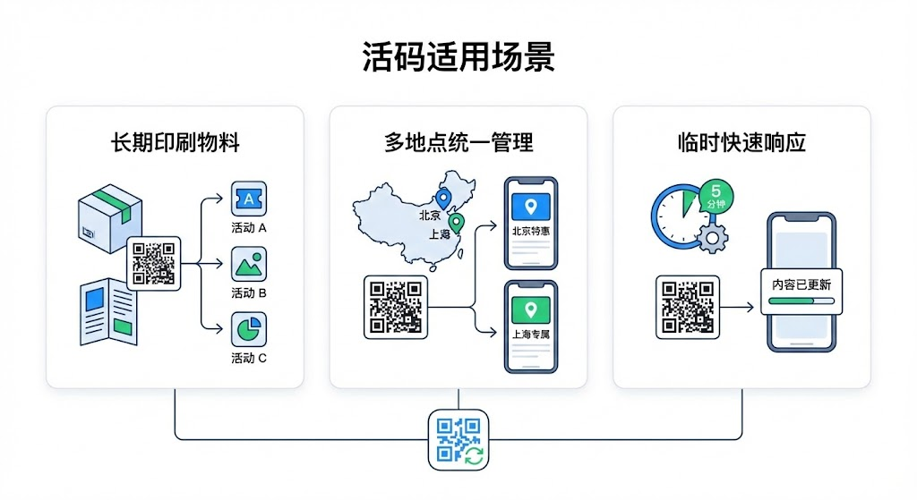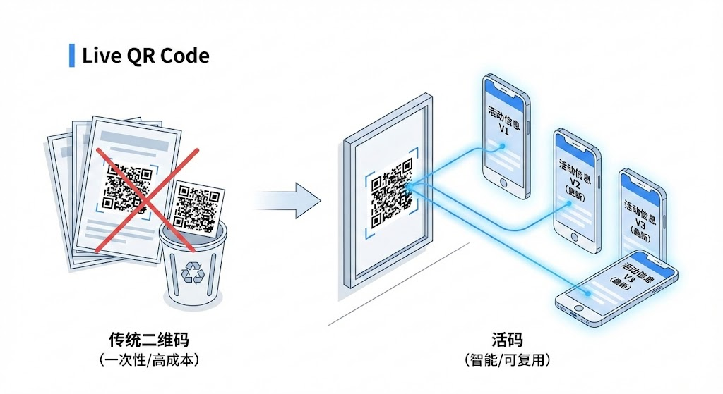 做过线下推广的人都遇到过这个难题:海报刚印好,活动方案就要调整。扔掉重印?成本太高。继续用?信息不对又会误导客户。活码的出现改变了这个局面——它让二维码从"一次性消耗品"变成了"可反复使用的工具"。