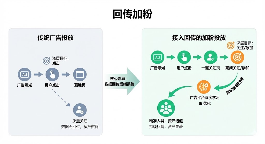 同样花钱投广告加粉,有人积累了可持续变现的用户资产,有人只收获了一堆僵尸粉。核心差异在于是否接入数据回传机制。传统投放像撒网捞鱼后又放生,回传加粉则是建鱼塘养殖。很多企业投信息流广告时会发现:明明都是加粉,为什么有的账号半年后还能持续产生订单,有的粉丝加完就成了摆设?问题不在粉丝数量,而在你用什么方式把他们留下来。