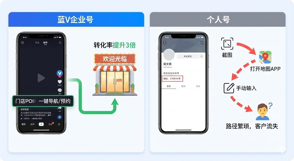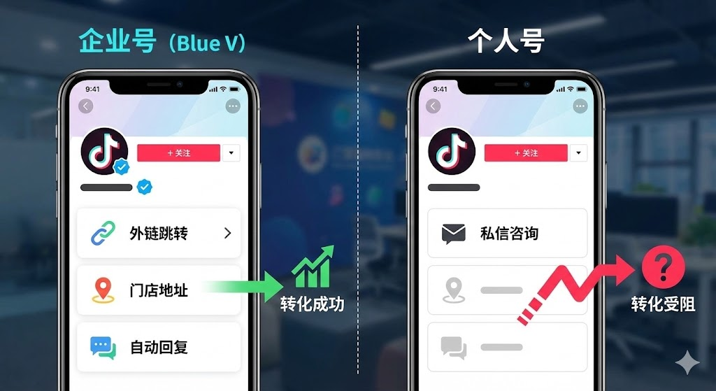 抖音账号类型不同,跳转卡片权限差异明显。蓝V企业号支持外链、门店地址和自动回复,个人号几乎没有这些功能。选错账号类型,转化路径会多出好几步,直接影响获客效率。做抖音运营最常见的困境是视频播放量破万,但私信咨询转化成交的比例低得可怜。问题可能不在内容,而是账号类型选错了。