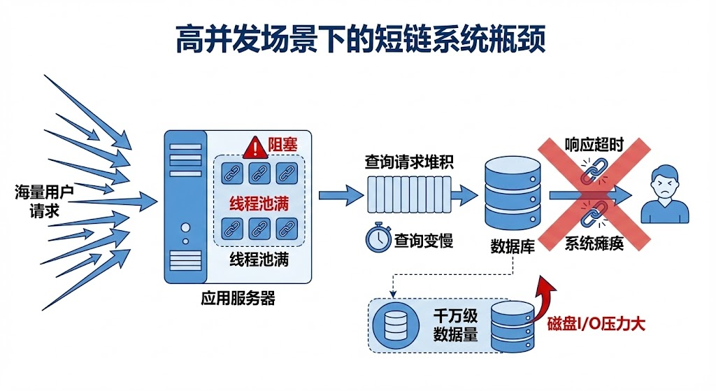 数据库查询变慢后,应用服务器的线程会被占用,无法及时释放。新请求进来时发现可用线程不足,只能继续等待。这种"慢"和"堵"的恶性循环,最终会让整个系统陷入瘫痪。用户点击短链后页面长时间无响应,跳转失败率大幅上升。随着业务增长,短链数据表的记录数会持续增加,单表数据量突破千万级后,即使是简单的查询操作,也需要扫描大量数据页,这不仅拖慢查询速度,还会增加磁盘I/O压力,影响整体系统稳定性。