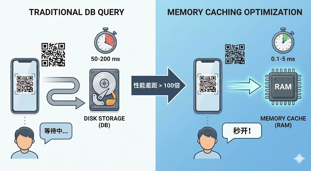 活码系统的核心优化,是把跳转规则预先加载到内存中。用户扫码后,系统直接从缓存读取目标链接,无需查询数据库。传统数据库查询涉及硬盘IO操作,响应时间通常在50-200毫秒,而内存缓存的读取速度仅需0.1-5毫秒,性能差距超过百倍。这种量级的提升,直接决定了用户扫码时是"秒开"还是"转圈等待"。