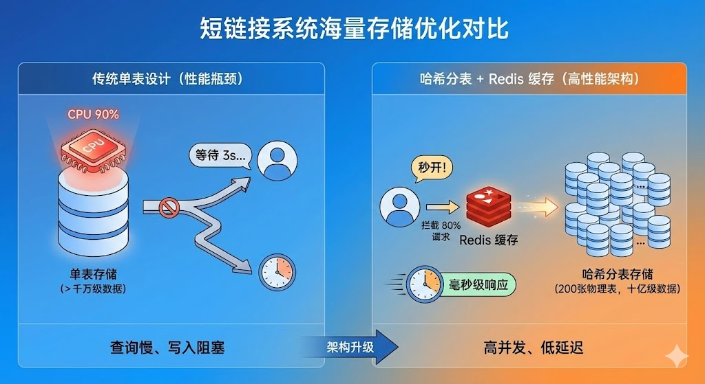 当短链接系统日生成量突破百万级,单表存储会导致查询变慢、写入阻塞。本文拆解海量映射关系的存储架构:通过哈希分表将数据分散到200张物理表,配合Redis缓存拦截80%请求,让系统在十亿级数据量下依然保持毫秒级响应。运营活动推广时,短链接生成速度越来越慢,数据库CPU飙到90%,用户点击跳转要等3秒才能打开,问题往往出在存储层——当映射表数据量超过千万级,传统单表设计会成为性能瓶颈。