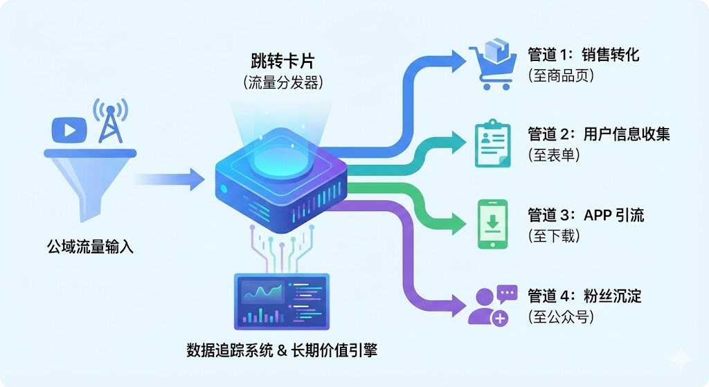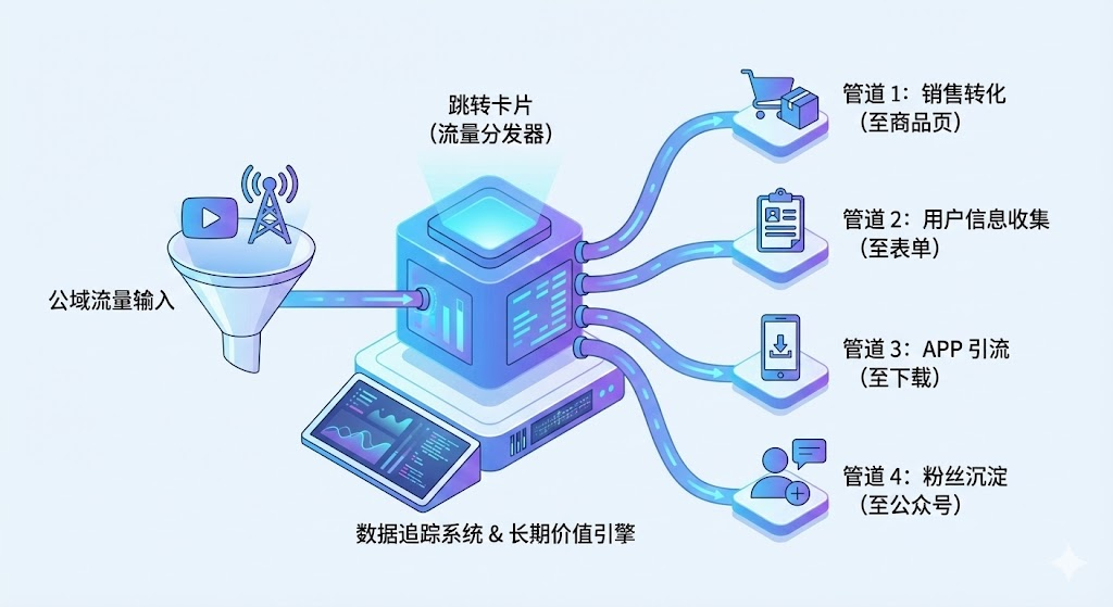 跳转卡片的本质是流量分发器。它能把公域流量导向不同目的地:商品详情页、留资表单、App下载页、公众号关注页。用户点击卡片的那一刻,你就有机会把他们从"路过的观众"变成"可持续运营的资产"。