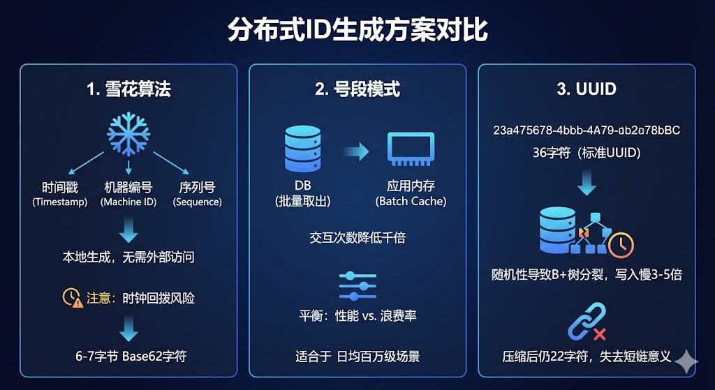 • UUID能保证全球唯一但有致命缺陷——标准UUID是36个字符即使去掉连字符也有32位,转成Base62编码压缩后仍然需要22个字符左右已经失去了短链接的意义。另外UUID的随机性会导致MySQL的B+树索引在插入无序数据时需要频繁分裂页面,写入速度会比有序ID慢3-5倍。