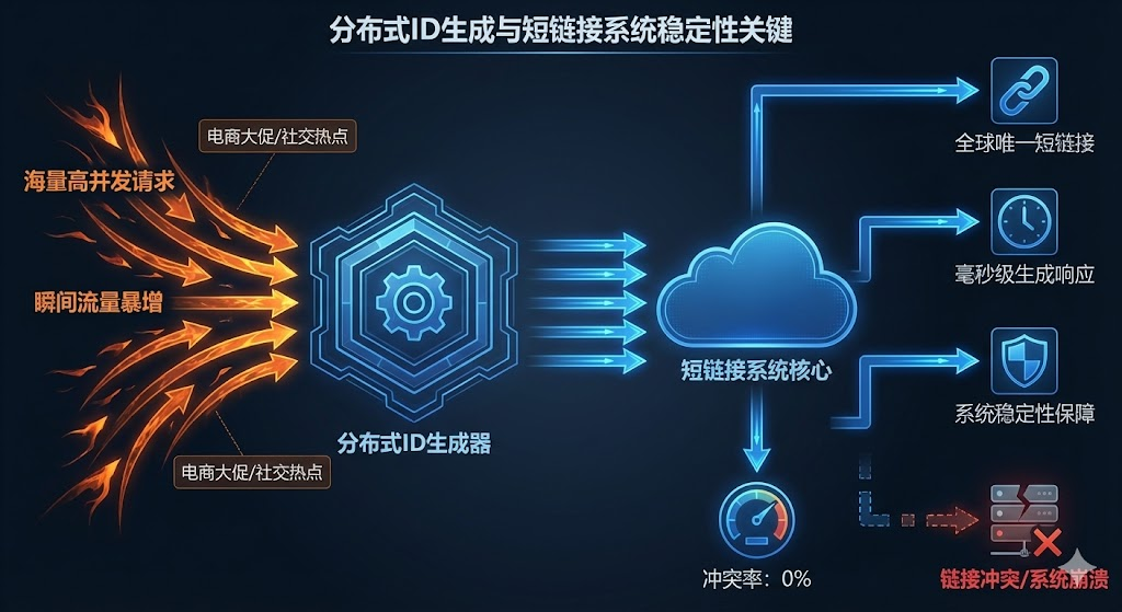 短链接服务每天处理海量转换请求,背后依赖分布式ID生成策略保证链接唯一性。选错方案可能导致链接冲突、性能瓶颈甚至数据错乱。短链接看起来只是把长网址变短,但高并发场景下,给每个链接分配唯一标识符是个技术难题。电商大促时营销团队可能1小时内生成10万条推广链接,社交平台的热点事件会让短链接请求瞬间暴增。这些场景对ID生成系统提出极高要求:既要保证全球范围内绝对不重复,又要在毫秒级完成生成,还得让最终的短链接足够简洁。