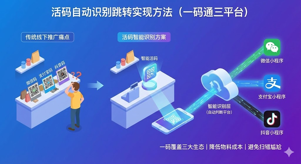 线下推广时需要同时准备微信码、支付宝码、抖音码?活码融合技术可以解决这个问题。通过在二维码中嵌入智能识别层,用户扫码后系统自动判断所在平台并跳转对应小程序,一个码就能覆盖三大生态,降低物料成本的同时避免用户扫错码的尴尬。线下门店做推广最头疼的就是二维码太多,收银台贴一个微信小程序码,旁边再贴支付宝的,如果还想引流到抖音得再加一个,顾客站在那儿看半天不知道该扫哪个。