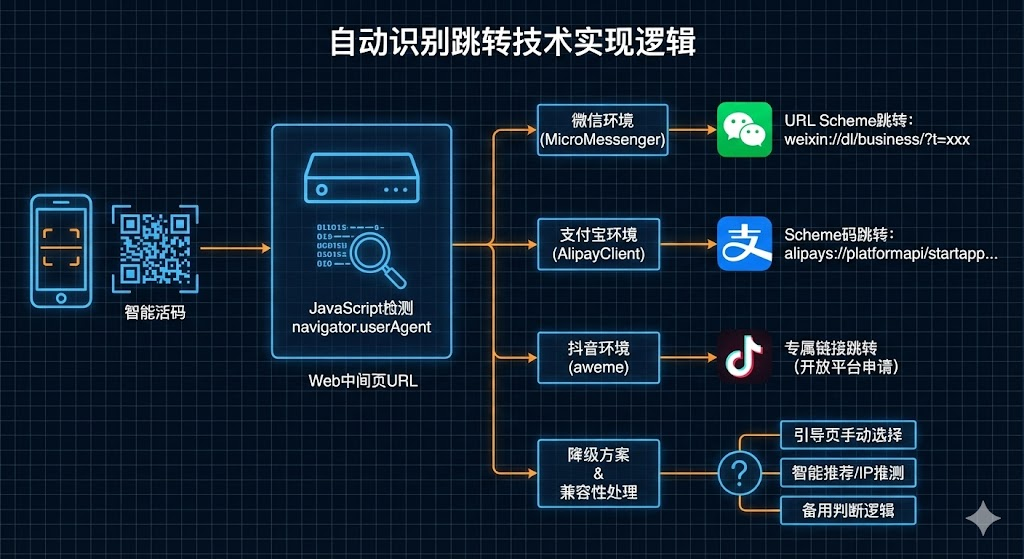 • 中间页识别机制:活码指向Web中间页URL,用户扫码后先打开该页面,嵌入的JavaScript代码读取navigator.userAgent参数检测浏览器环境,微信包含MicroMessenger、支付宝包含AlipayClient、抖音包含aweme关键词