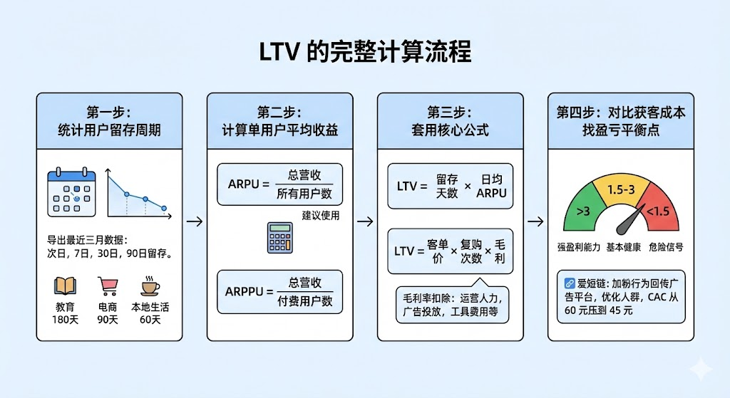 • 第三步套用核心公式:最简化公式是LTV=留存天数×日均ARPU。如果业务有明确复购周期,用LTV=客单价×复购次数×毛利率。毛利率要扣除运营人力、广告投放、工具费用等分摊成本