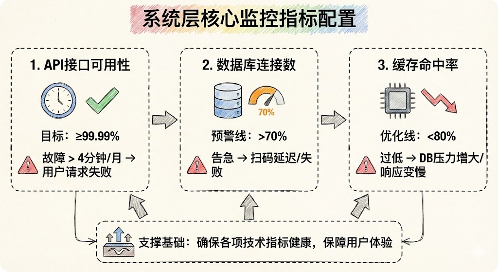 数据库连接数告急时,新用户扫码会延迟甚至失败;缓存命中率低会导致数据库压力增大,影响整体响应速度。系统层指标是业务层指标的支撑基础,需要建立完善的监控机制,确保各项技术指标处于健康状态。