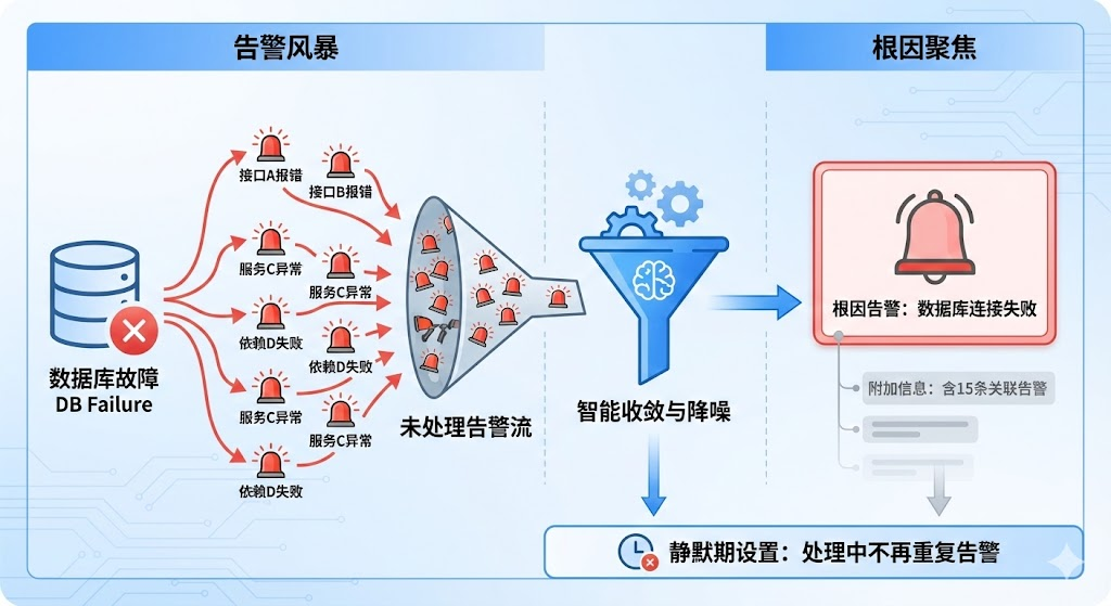 同一个故障可能触发多条告警。数据库连接失败会导致所有依赖数据库的接口报错,每个接口都发送告警会让运维人员被信息淹没。告警收敛通过关联分析,将同一根因引发的多条告警合并为单一事件。