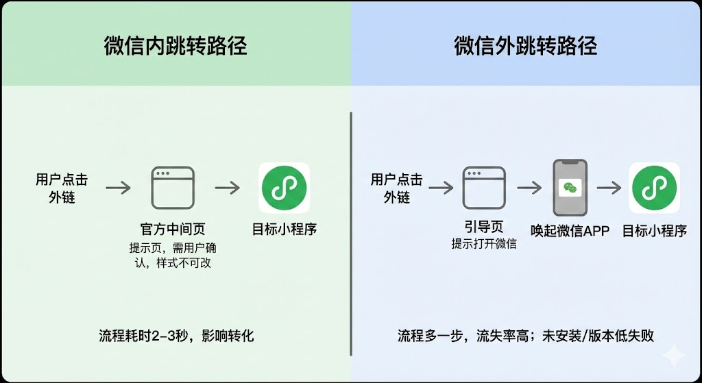 当用户在微信内点击外链时,跳转路径会经过一个中间页。用户先看到跳转提示页,点击页面上的按钮后才能进入目标小程序。这个中间页是微信官方提供的,开发者无法自定义样式。页面上会显示小程序的名称、图标和简介,用户确认后才会跳转。整个流程大概需要2-3秒,对转化率有一定影响。