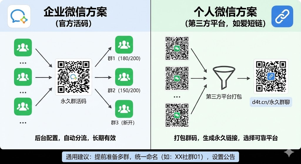 个人微信用户需要借助第三方工具实现类似功能。市面上有不少提供群活码服务的平台,比如爱短链就支持微信群、企业微信群和QQ群的活码生成。这类工具的核心逻辑是:你提供多个群的二维码,平台帮你打包成一个永久链接或二维码。使用时要注意选择稳定可靠的平台,有些小工具可能存在数据安全隐患,或者服务不稳定导致活码失效。优先选择运营时间长、用户评价好的成熟产品。