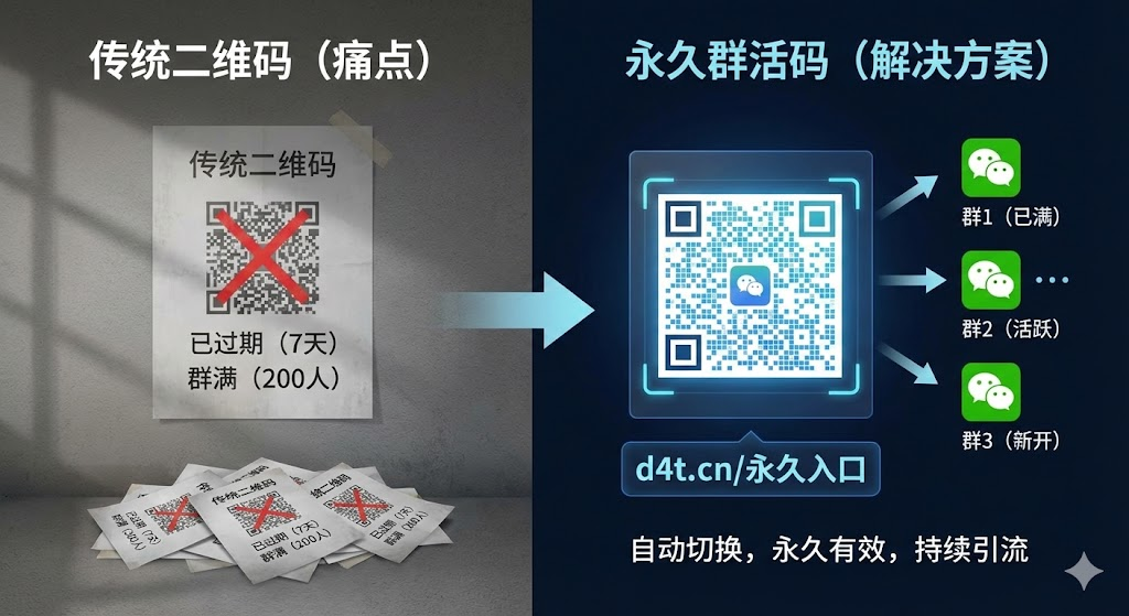 好在现在有成熟的解决方案——群活码。它能让你的二维码长期有效,还能在群满时自动切换到新群,真正做到一码多用。本文教你用群活码技术彻底解决过期和人数限制问题,一个二维码持续引流,不再反复更换。