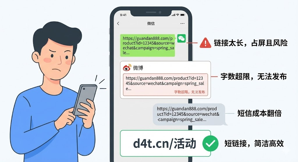 一串包含问号、等号、百分号的长链接,夹在文案中间特别突兀。用户看到密密麻麻的字符,第一反应可能是"这链接安全吗",而不是点进去看内容。朋友圈分享时,长链接会自动折叠,显示成"查看全部",这多一步操作就会流失一部分点击。某些社交平台对外部链接有严格限制,带有复杂参数的长网址容易被识别为营销链接,发出去后可能不显示预览图,甚至直接被折叠或标记为风险内容。