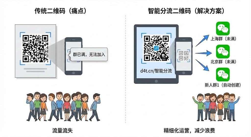 线下活动、门店引流时,单个群二维码很快满员,后续用户扫码进不去就流失了。现在有种智能分流二维码,扫一次就能根据地域、人数自动分配到不同群,还能满群后自动建新群。本文拆解这类二维码的技术原理和配置方法,帮你减少流量浪费,实现精细化运营管理。