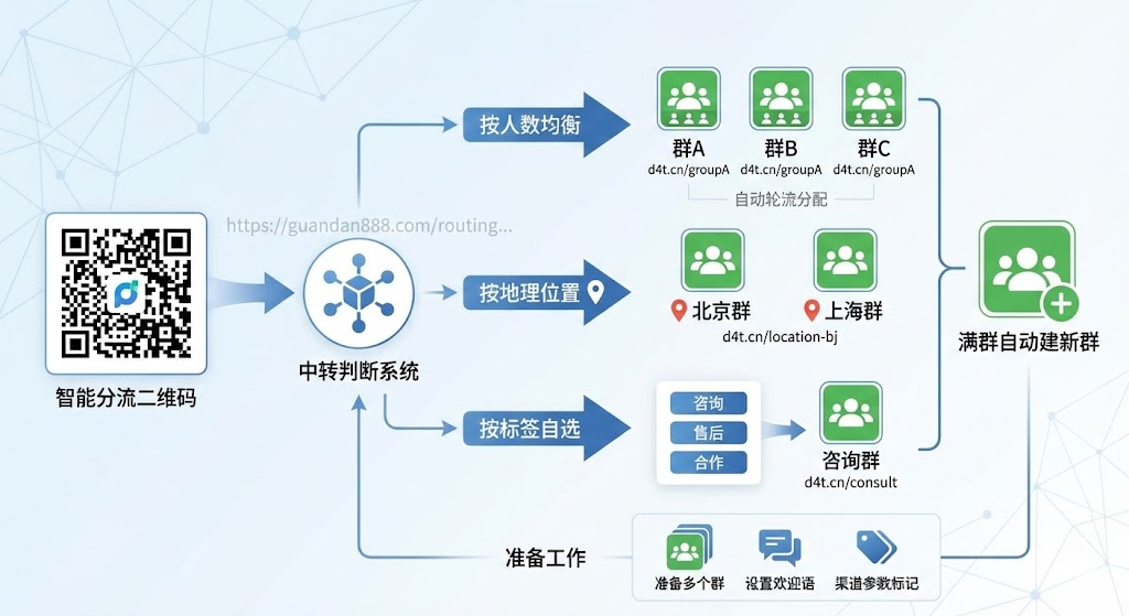 这类二维码本质上是个中转链接。用户扫码后先跳转到判断页面,系统根据预设规则(地域、人数、标签)计算出最合适的群,再推送对应的入群邀请。整个过程在1-2秒内完成,用户几乎感知不到中间环节。