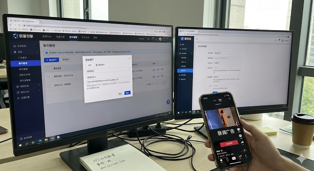 有些工具还支持数据自动回传功能。比如你在抖音巨量引擎投放广告,可以把爱短链的转化数据回传到巨量后台,让广告系统知道哪些投放带来了真实转化,从而自动优化投放策略。具体操作是在巨量引擎的事件管理里添加橙子落地页资产,配置好转化事件(比如"成功添加好友""用户首次开口"),然后选择API回传方式,系统就会自动把记录的用户行为数据提交给巨量引擎。
