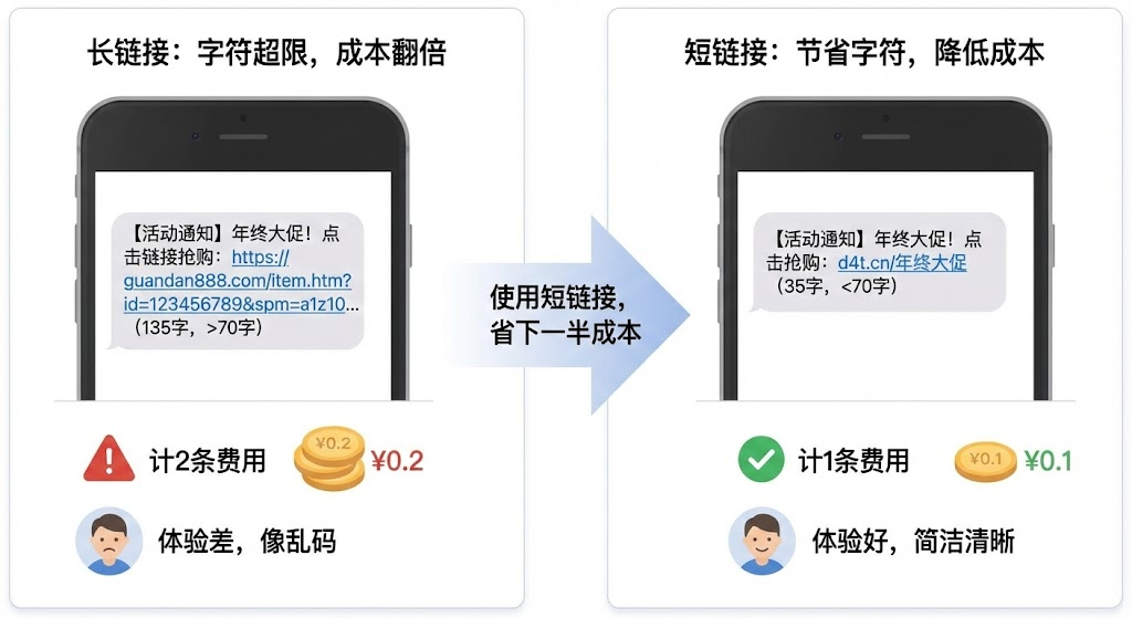 短信推广的成本压力,做过运营的都懂。明明只想发个促销通知,结果因为链接太长,70字的内容硬生生变成2条短信收费。更糟的是,那串像乱码的长链接,用户看一眼就想删。问题出在短信计费规则上:国内短信以70字符为单位计费,超出按倍数收。而一个普通的电商链接或活动页面URL,往往有80-150个字符。当你把"https://guandan888.com/item.htm?id=123456789&spm=a1z10..."塞进短信时,剩余可用字数已经不多了。