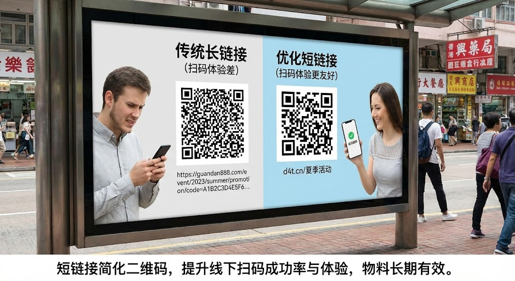 线下物料的设计空间寸土寸金。产品包装要塞进品牌logo、成分说明、使用方法,海报要突出视觉主体和促销信息,宣传单页要平衡图文比例。这时候放个冗长网址或复杂二维码,不仅挤占版面,还让整体设计显得杂乱。更要命的是,印刷后的内容无法修改——活动页面一调整或链接失效,成千上万份物料直接报废。短链接能同时解决空间占用、视觉美观和内容更新三大痛点,让线下推广变得灵活可控。