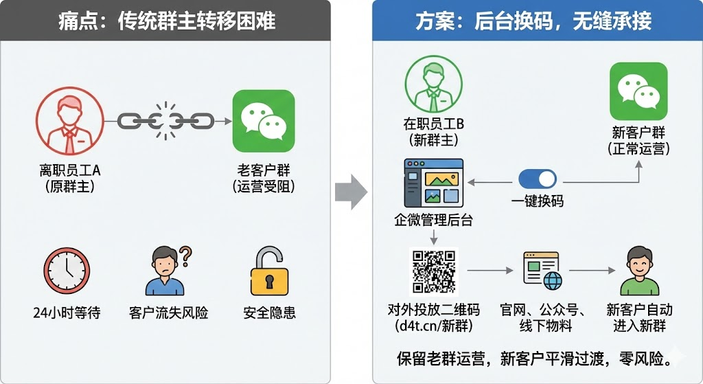 企业微信客户群的归属问题,在员工离职时总会让运营负责人头疼。群里沉淀着几百个客户,但群主身份在离职员工手里,企业想接管却发现流程复杂,还要担心操作不当引发客户反感。传统的群主转移需要24小时等待期,还可能引发客户流失,而更灵活的方案是保留原群正常运营,通过后台更换对外投放的群二维码,让新增客户自动进入新群。
