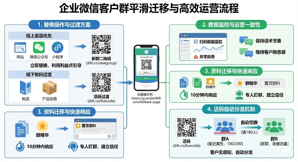 更稳妥的做法是换码不换群,保留原有客户群正常运营,同时创建新群承接后续流量。在企业微信管理后台新建客户群,指定在职员工作为群主,生成群二维码时同步设置好自动欢迎语。把原来群二维码出现的所有渠道列个清单,包括官网底部、公众号自动回复、线下宣传单页、电商平台客服话术等,这一步很关键,漏掉任何一个渠道都可能让客户进错群。