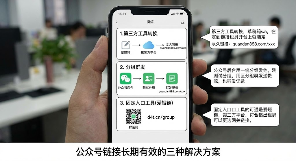 运营公众号的人经常遇到这样的情况:在菜单栏放了社群邀请说明的链接,过几天用户点进去就显示"临时链接已失效"。这是因为公众号草稿预览链接只有12小时或500次阅读的有效期,对于需要长期展示的内容来说,这个限制确实很麻烦。特别是社群邀请入口、会员权益介绍、产品详情页这类内容,既不适合占用每月有限的群发次数,又需要随时让用户能看到。如果能有一个永久有效的链接,放在菜单栏、自动回复或社群公告里,就能省去频繁更换的麻烦。