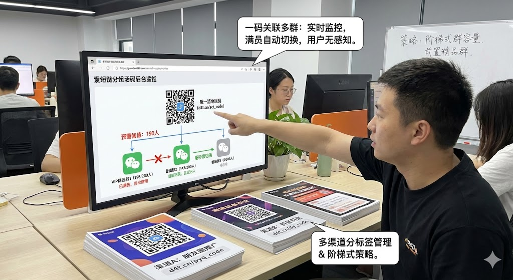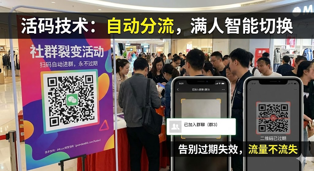 做社群裂变最怕什么?活动刚推出两天,群二维码因为满200人就扫不进了。赶紧换新码发到各个渠道,结果旧码还在传播,新用户扫了提示已失效。微信群二维码本身只有7天有效期,裂变周期稍长就得反复更换。这种断层直接导致用户流失,转化率大打折扣。活码技术的出现,彻底解决了这些限制,通过自动分流机制让一个码关联多个群,系统实时检测人数并智能切换,确保每位用户都能顺利进群。