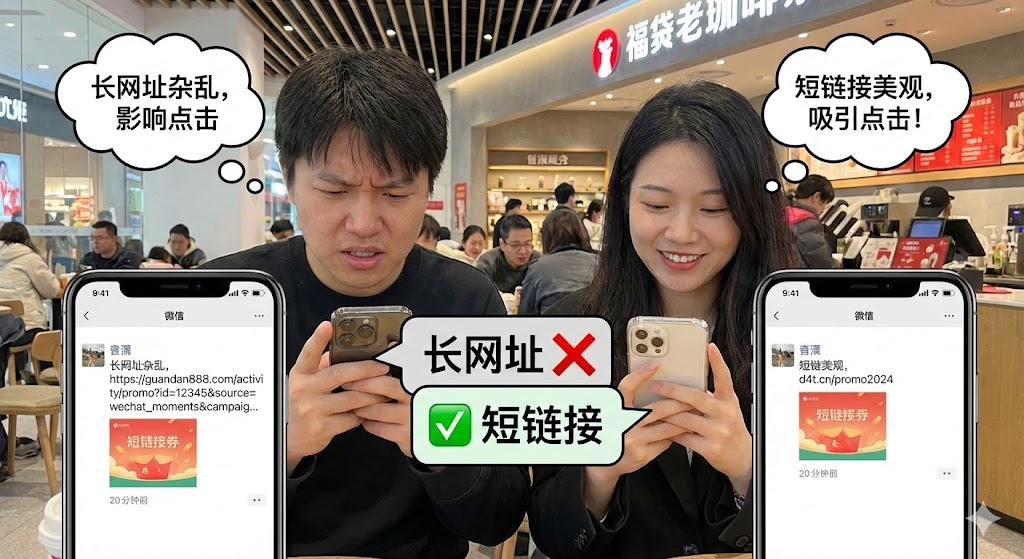 一条完整的长网址包含域名、路径、参数等多个部分,动辄几十个字符。出现在朋友圈里,直接占据手机屏幕的三分之一甚至更多空间。你原本想突出的核心卖点、精心设计的钩子文案,全被这串字符挤到了次要位置。用户的注意力被分散,第一眼看到的是混乱而非价值。