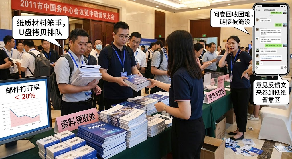 会后发放的纸质问卷填写率常年维持在百分之三十以下,线上问卷链接发到群里也容易被刷屏信息淹没。没有真实的参会体验数据,主办方很难知道哪些环节做得好,哪些地方需要改进,下次活动只能凭感觉调整。