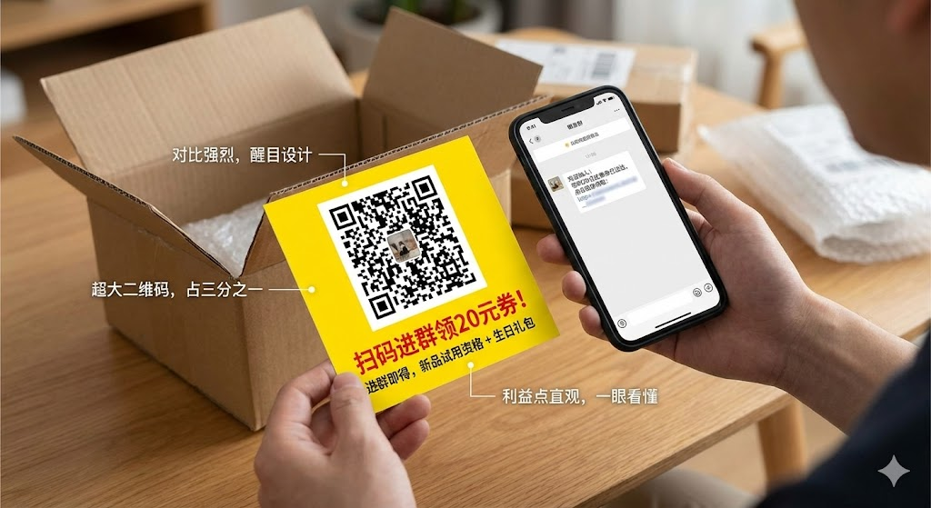 用户拆包裹的时候,注意力只有几秒钟。包裹卡的设计要足够醒目,才能让他们停下来扫码。用对比强烈的颜色,比如红色、黄色做底色,二维码要够大,至少占卡片面积的三分之一。文案要简短直接,可以写「扫码进群领20元券」,或者「进群解锁会员价」,重点是让用户一眼看到能得到什么好处。