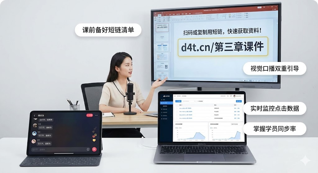 • 配合视觉和口播引导。分享短链接时,别只是默默贴到聊天区。把短链接放大显示在屏幕共享的PPT上,用荧光笔标注或加粗字体,确保学员注意到。同时口头提示:「大家看屏幕右上角这个短链接,复制到浏览器就能下载课件,只有十几个字符,手机输入也很快。」多感官配合,能让学员快速定位信息。短链接本身字符少,学员读一遍就能记住大概,即使没来得及复制,课后也能凭印象找到。