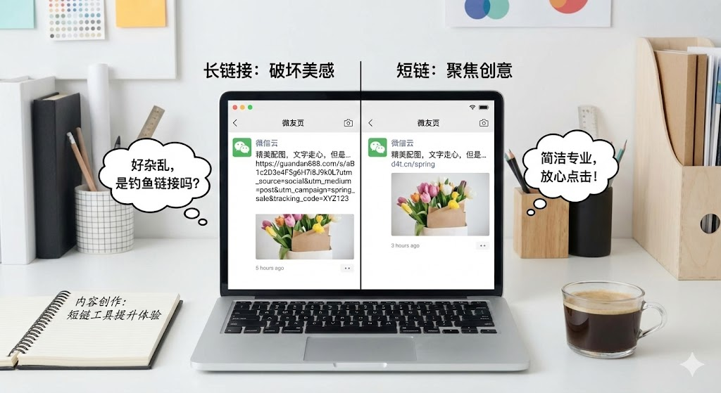 营销文案里插入长链接,常常让整体排版显得杂乱无章。那些带着参数和追踪代码的URL,不仅占用字数空间,还会分散用户注意力。朋友圈刷到一条推广文案,配图精美、文字走心,结尾却突然冒出一串问号、等号和乱码组成的长链接——这体验就像精心准备的菜品里混入了包装纸。长链接不仅破坏视觉连贯性,还容易让人怀疑"这是钓鱼链接吗"。在社交媒体和内容营销场景中,链接的呈现方式直接影响用户信任度和点击意愿。短链接的出现,正是为了解决这个困扰运营人员已久的问题。