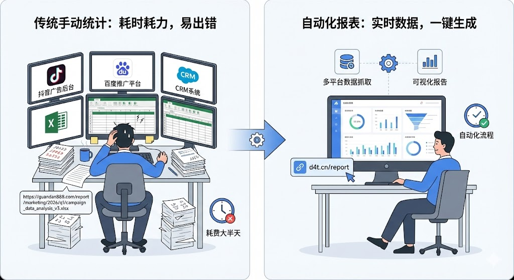 营销活动结束后,运营团队常常要花大半天时间在各平台导数据、做表格、核对转化漏斗。每次营销活动结束,运营团队最头疼的环节往往不是活动执行,而是数据统计。抖音广告后台导出加粉数据,百度推广平台查看点击量,CRM系统核对转化记录,再把这些数据整理到Excel表格里,逐一计算转化率和ROI。