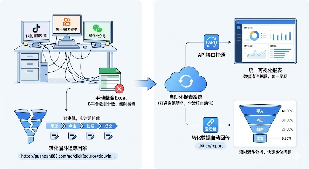 运营团队需要在多个平台之间切换。抖音广告的加粉数据在巨量引擎后台,快手推广的转化数据在磁力金牛系统,微信公众号的关注数据又在另一个地方。每个平台的数据格式不同,导出规则也不一样,手动整合这些数据既费时又容易出错。