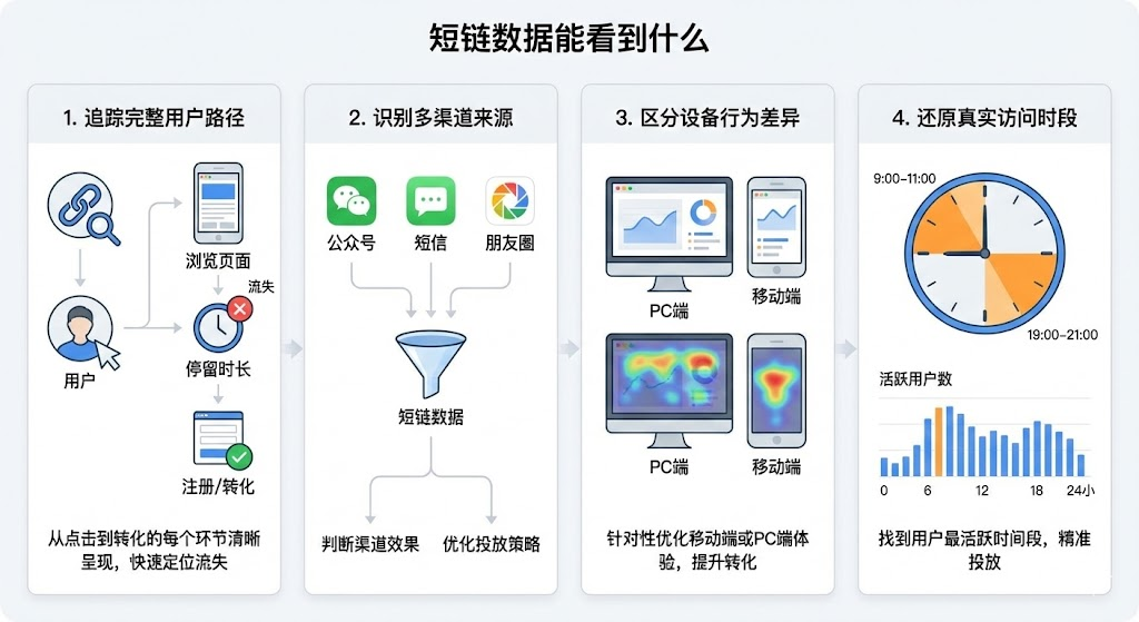 短链数据不只记录点击次数,它能捕捉用户从看到链接、点击进入、浏览页面到最终转化的全过程。多少人点了链接但没完成注册?多少人在支付页面停留后离开?这种完整的行为链条,帮你快速定位流失环节。