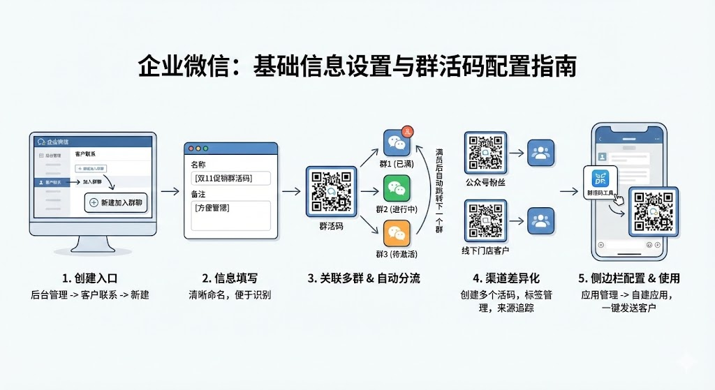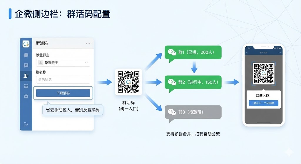 2. 群活码把流程自动化了。后台配置好规则,系统根据群容量自动分配客户。准备5个群,第一个满200人后,新客户扫码自动进第二个群,完全不需要手动干预。