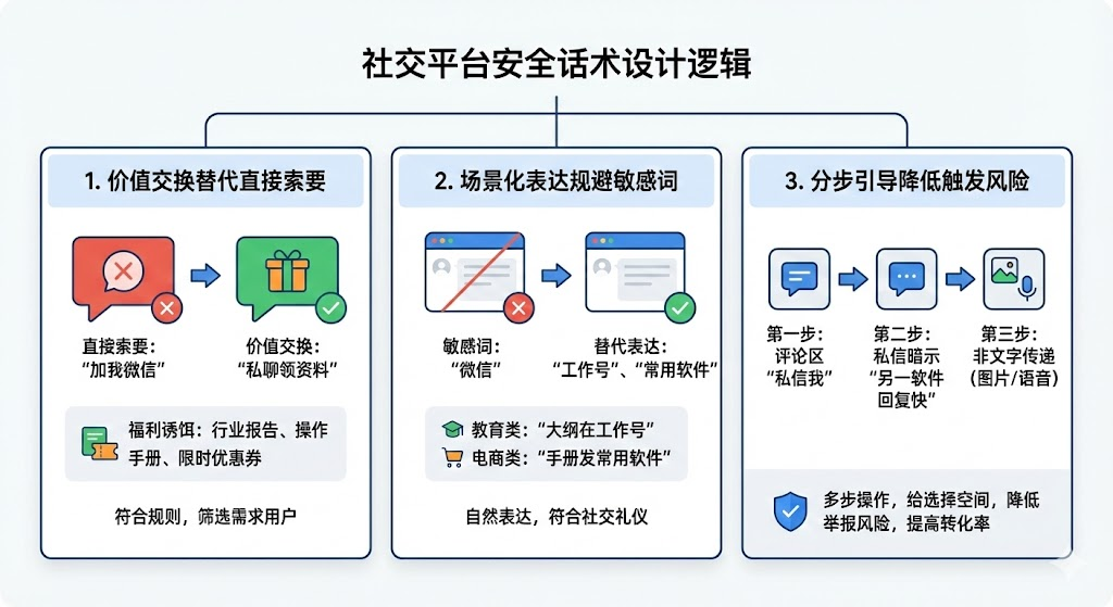 • 用价值交换替代直接索要:别直接说"加我微信",换成"想深入了解可以私聊领取完整资料"。设置具体的福利诱饵,比如行业报告、操作手册、限时优惠券,让粉丝主动来询问联系方式。这种方式既符合平台规则,又能筛选出真正有需求的用户。