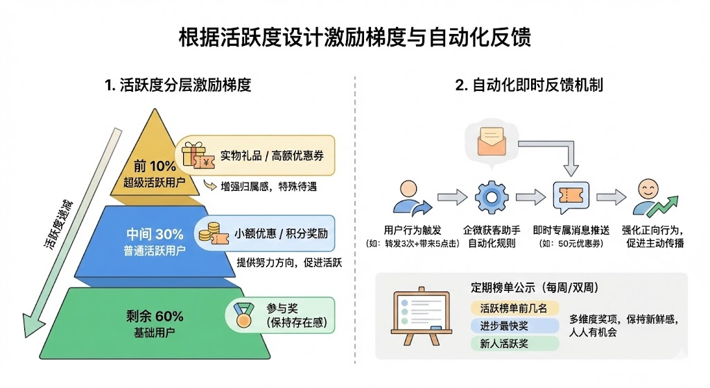 别给所有人发一样的福利,按活跃度分档次每个档次对应不同奖励效果会好很多。把成员分成三层,前百分之十是超级活跃用户给实物礼品或高额优惠券,中间百分之三十是普通活跃用户给小额优惠或积分,剩下的人给参与奖保持基础存在感。这种梯度设计有两个好处,让高价值用户感受到特殊待遇增强归属感,给普通用户一个努力方向下次活动可能更积极。