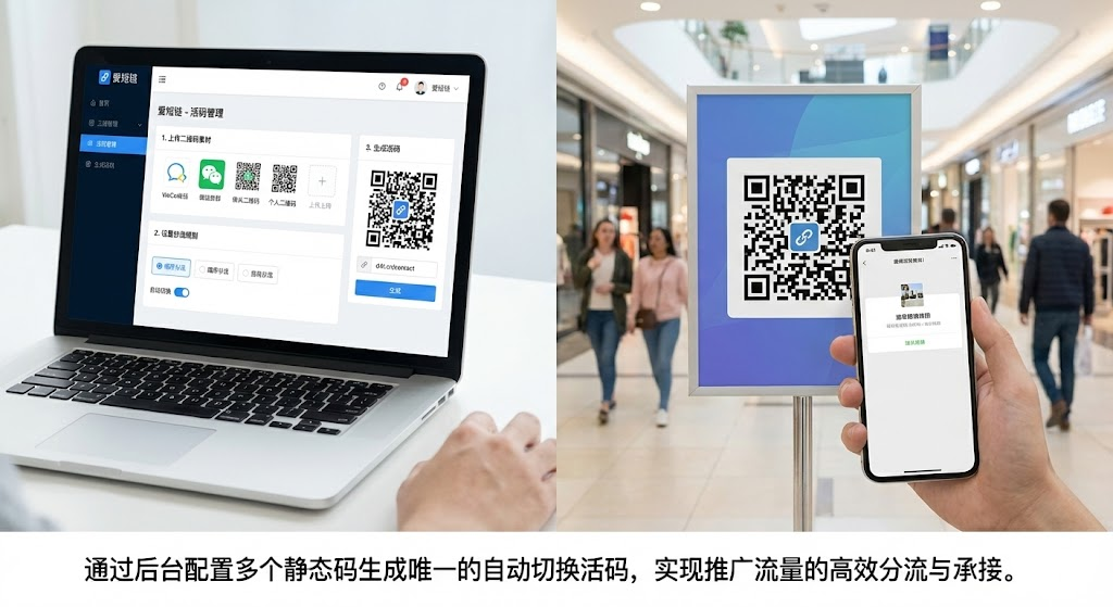 第二步登录爱短链创建活码:注册登录后点击「活码管理」-「新建活码」,选择企业微信、微信群或个人微信类型,上传准备好的二维码支持批量上传,设置分流规则「顺序分流」按顺序展示或「随机分流」平均分配流量,开启「自动切换」功能这步必须做否则客户扫码还是会失败,生成并下载活码图片。