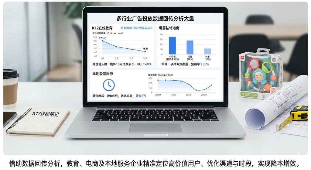 教育机构从盲投到精准狙击:某K12在线教育机构每月投30万广告费,加粉3000人,但真正报名的不到50人。配置回传后,平台识别出"愿意留手机号+晚上8-10点活跃的家长"才是高价值人群,系统自动优化投放。3个月后,单个有效线索成本从120元降到75元,ROI提升60%。