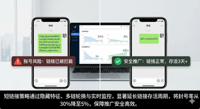 微信封号的本质是风控系统对营销行为的识别与打击。短链接通过隐藏特征、分散风险、灵活替换,能有效延长链接存活时间,降低账号封禁概率。但技术手段只是辅助,合规运营才是根本。选对工具、用对方法,配合多链接轮换、频率控制、实时监控等策略,你的推广链接才能在微信生态里活得更久,账号才能更安全稳定地运营下去。