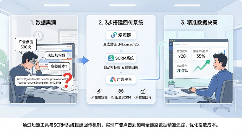 每天烧几千块投广告,到底带来多少个粉丝?哪个渠道转化最好?大多数投放专员都卡在这里:广告后台显示点击了500次,但企业微信里到底加了多少人、哪些是广告带来的,完全分不清。本文教你用短链工具+SCRM系统搭建回传机制,实现广告点击到加粉全链路数据打通。三步配置完成后,每个渠道的加粉成本、转化效果一目了然,帮你精准优化投放策略,降低获客成本。