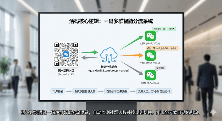 活码的核心逻辑是一码多群智能分流。提前准备多个社群二维码上传到活码系统,设置切换规则(比如每群190人自动切换)。用户扫码时系统自动识别各群人数,将用户引导至未满的群,整个过程无需人工干预,24小时自动运行。